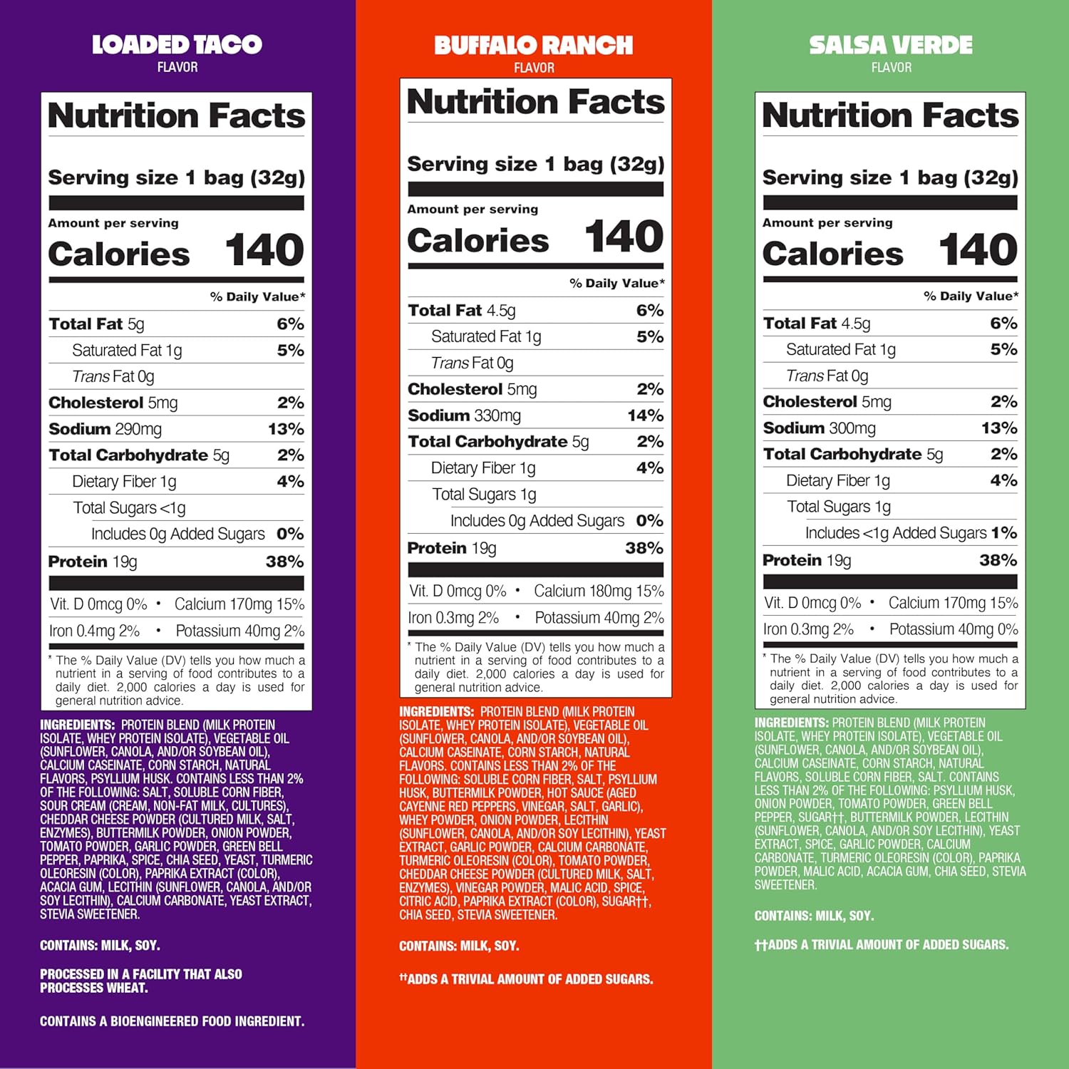 Available in four satisfyingly savory flavors, Nacho Cheese, Ranch, Chili Lime and Loaded Taco.